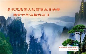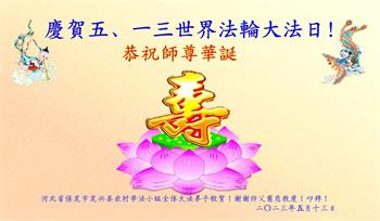 【明慧网二零二三年五月十二日】 河北保定定州市一学法小组全体大法弟子恭祝师尊生日快乐!恭祝法轮大法日!