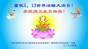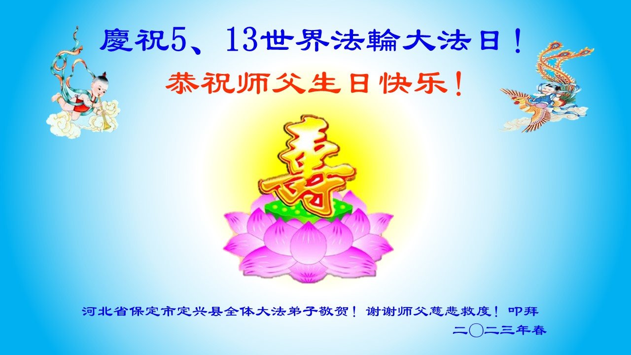 愿世界法轮大法日早日成为中国人民的节日盛典,愿普天同庆的日子早日到来,谢谢师尊对众生的恩典! 河北保定市定兴县全体大法弟子恭祝慈悲伟大的师父生日快乐!