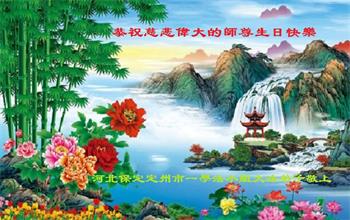 恭祝慈悲伟大的师尊生日快乐!恭庆世界法轮大法日! 作师父的弟子,无上的荣幸,无尽的感恩。感恩师父在芸芸众生中选择了我,让我成为众生羡慕的生命,成为一名正法时期的大法弟子。感恩师父在我二十七年的修炼中保护着我,使我一直平稳的走到今天。感恩师父给予一切。感恩!无尽的感恩!佛恩浩荡,师恩难报啊! 唯有精進实修,做好三件事,不负师恩,完成使命,随师回家。 叩谢师尊 河北省保定涞源县大法弟子敬上 河北省保定市一学法小组大法弟子恭祝师尊生日快乐!