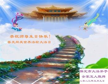 千言万语也无法表达师尊的救度之恩。弟子唯有精進更精進。在做好三件事上下功夫。在实修方面多努力。在师父的加持下,正念正行多救人。以报师恩。 河北省保定市一学法小组大法弟子敬上 2023年5月7日 河北省保定市涿州市一家五口大法弟子恭祝慈悲伟大的师尊生日快乐!