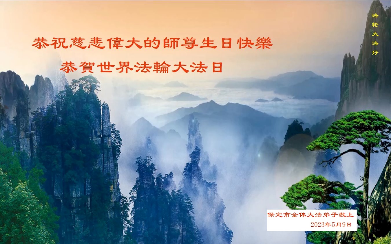 感念师尊救度恩 不辱使命勇精進 努力践行真善忍 常把法宝牢记心 修炼路上恩师护 救度众生传佳音 保定市全体大法弟子恭祝师尊生日快乐!同庆同贺世界法轮大法日! 2023年5月9日 河北省保定一学法小组大法弟子恭祝师尊生日快乐!庆祝法轮大法洪传三十一周年!法轮大法好,真善忍好。