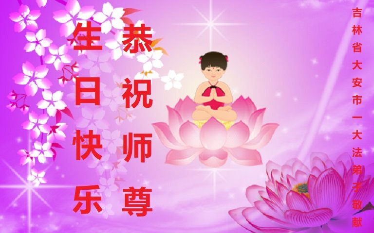 是您的教诲唤醒了我的良知,使弟子没有在灯红酒绿的社会中随波逐流;是您的教诲唤醒了我心底的善,是弟子守住了做人的准则,从而发自内心的善待身边的人,没有在世间沉沦;是您的教诲是我扩大了胸怀,使弟子学会了忍让、包容,遇事不再计较;是您的教诲使我懂得了生命的可贵,从而更加珍惜我所遇到的一切生命和机缘;是您的教诲是我明白了生命的真正意义是为了返本归真。 感恩师尊洪传大法!师父您辛苦了! 弟子会在以后的日子里多学法、炼好功,助师正法 救度众生。 惟愿师尊笑!恭祝师尊生日快乐! 吉林省扶余市大法弟子叩拜! 吉林省白城市一大法弟子恭贺师尊华诞暨世界法轮大法日!