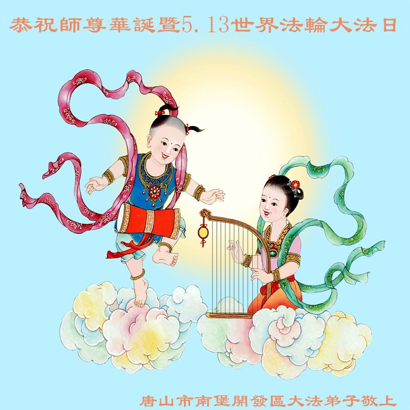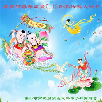 庆祝5.13世界法轮大法日!弟子们合十道一声:师父您辛苦了! 弟子们无比感恩师父这么多年来的慈悲看护和救度,弟子们一定会多学法,在法中归正不足,做好三件事,不论还有多长时间,一定跟随师父坚修大法到底!请师父放心。 弟子们跪拜师尊! 河北省唐山市古冶区大法弟子恭祝慈悲伟大的师尊生日快乐!恭祝世界法轮大法日!