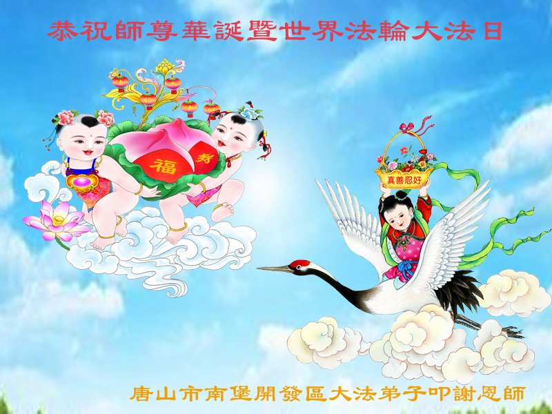 在世界法轮大法日到来之际,感恩的话语无以言表。只有精進实修自己,做好三件事,努力做师尊的合格弟子。 叩谢师恩!再次恭祝师尊生日快乐! 唐山市古冶区三口之家大法弟子敬上 河北唐山大法弟子恭祝师尊生日快乐!普天同庆世界法轮大法日!