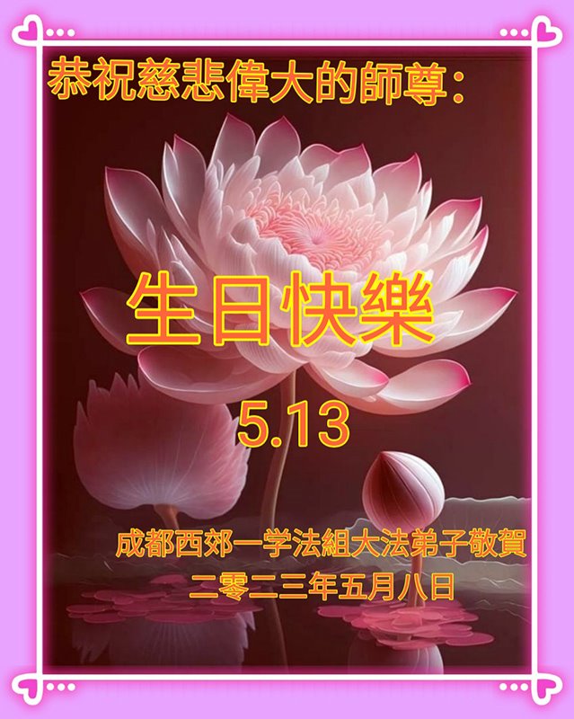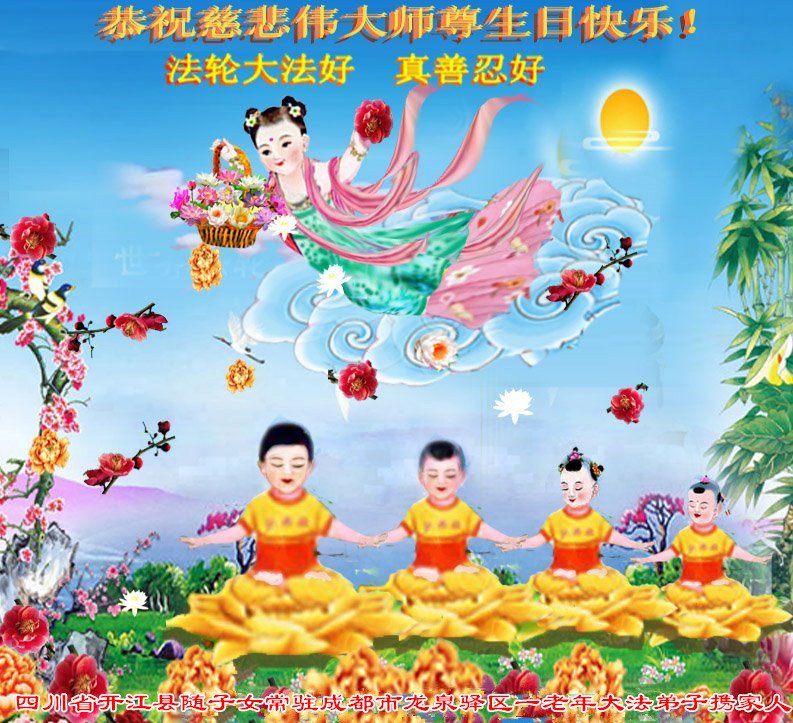 恭祝慈悲伟大的师尊生日快乐! 法轮大法好,真善忍好! 四川成都市西门片区大法弟子恭祝师尊华诞!
