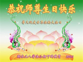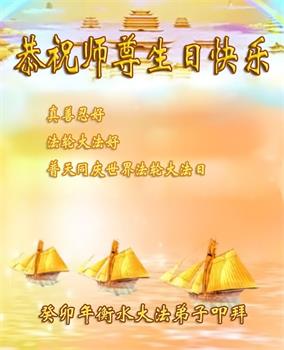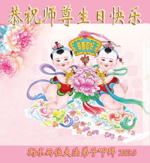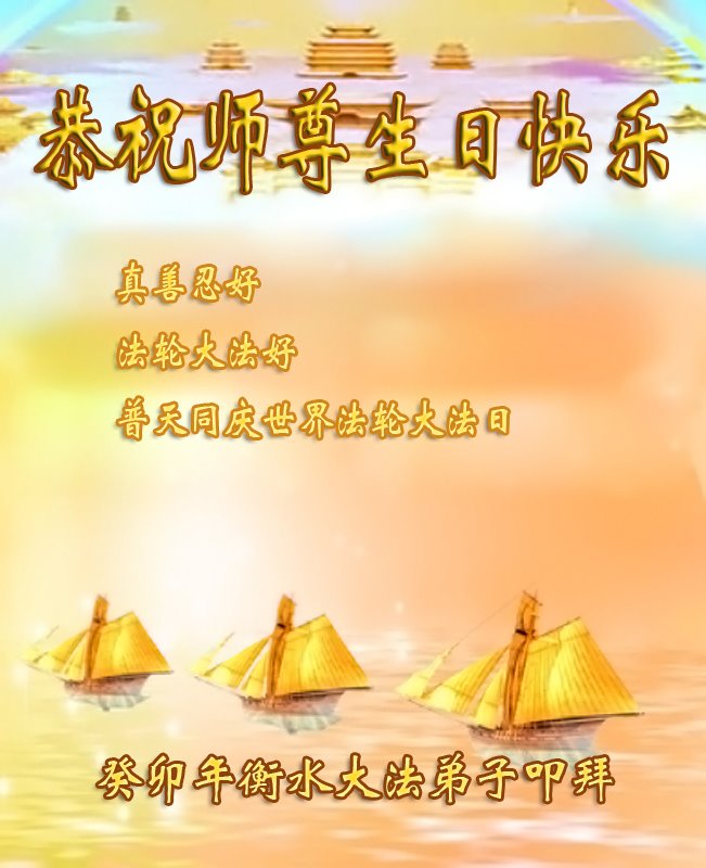 恭祝师父生日快乐!近期我们两个一起配合做救度众生的事,有师父加持,我们会做好的,请师父放心! 我们互相鼓励,互相帮助,互相提醒,学法修心向内找,提高心性层次,跟师父圆满回家。 河北衡水一学法小组五位大法弟子恭祝师尊生日快乐!