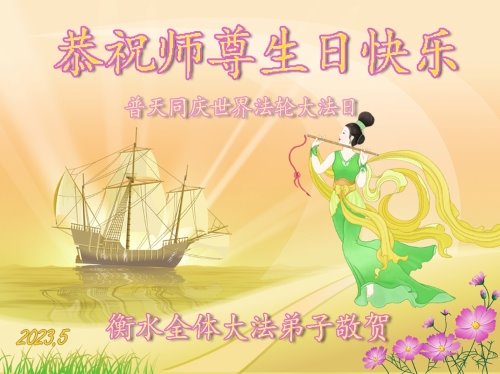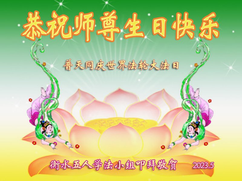 恭祝师父生日快乐!庆贺5.13世界法轮大法日! 大法洪传,众生有望。在这特殊的历史时刻,愿更多的世人明真相,得到大法的救度,拥有美好的未来。 河北衡水一学法小组弟子敬拜 2023年5月7日 河北衡水市一学法小组大法弟子恭祝师父生日快乐!