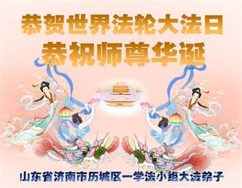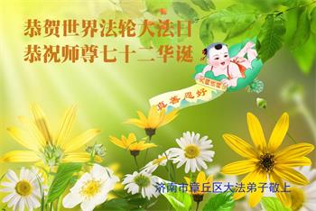 山东省济南市章丘市区两名大法弟子恭贺世界法轮大法日!恭祝师父生日快乐!