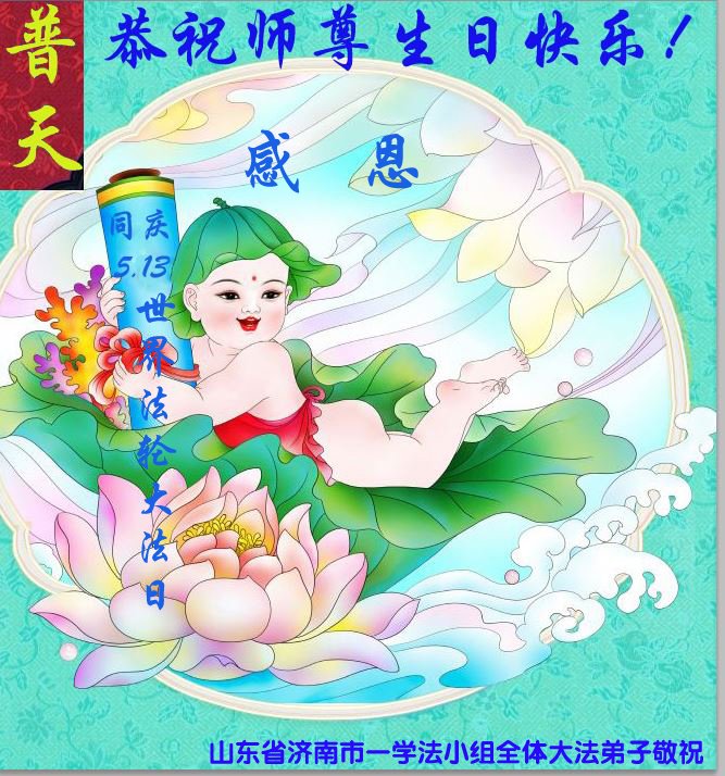 普天同庆法轮大法洪传三十一周年!恭祝师尊七十二华诞! 感恩慈悲伟大的师尊,将伟大的佛法洪传于世,让世上迷途中挣扎的众生从此找到了回家的方向! 感恩慈悲伟大的师尊,将红尘中业力满身的我捞起、洗净,并赋予我助师正法、救度众生的使命! 感恩慈悲伟大的师尊,在我修炼的路上一路引领保护,给我智慧、帮助我完成使命! 能得到慈悲伟大的师尊亲传救度,是弟子永生的荣幸! 山东济南市大法弟子恭祝恩师生日快乐!