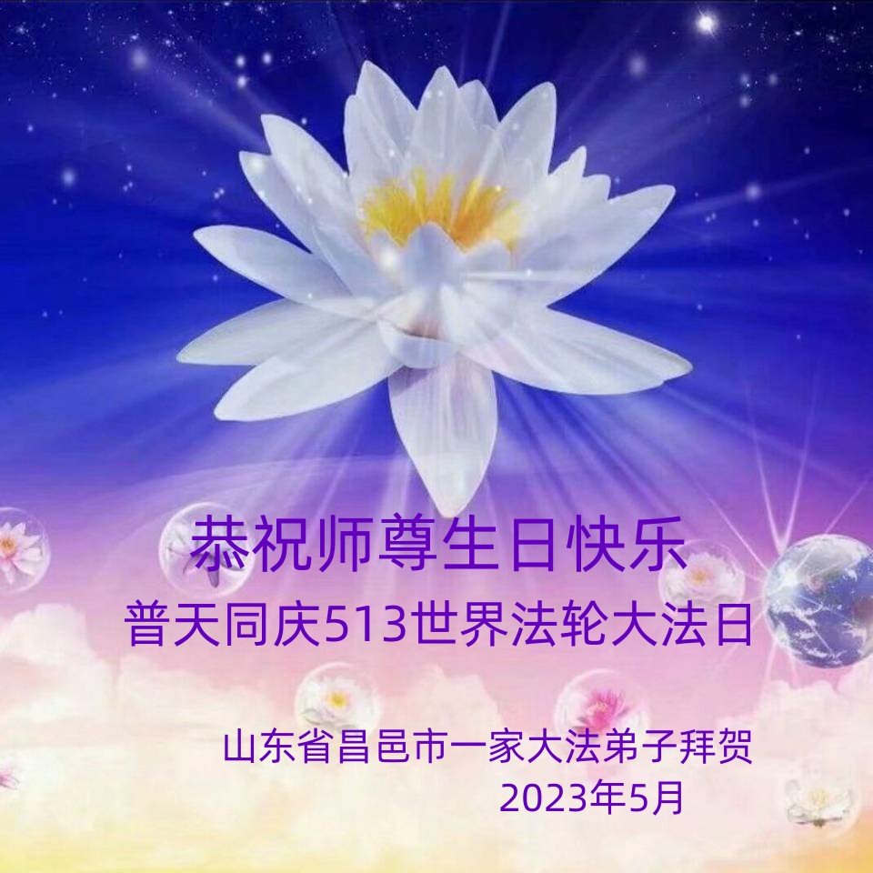 恭祝师尊生日快乐! 庆祝世界法轮大法日!恭贺法轮大法洪传31周年! 千言万语道不尽师尊的慈悲苦度,师父您辛苦了。 昌邑市一家大法弟子拜贺 2023年5月7日 山东潍坊市大法弟子恭祝慈悲伟大的师尊生日快乐!