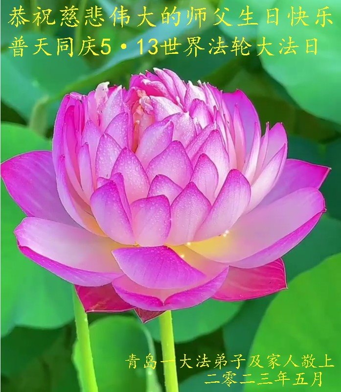普天同庆世界法轮大法日!恭祝师父生日快乐! 法轮大法好!真、善、忍好! 感恩师父慈悲救度! 青岛大法弟子恭祝 二零二三年五月九日 山东省青岛市一学法小组大法弟子恭贺法轮大法日!