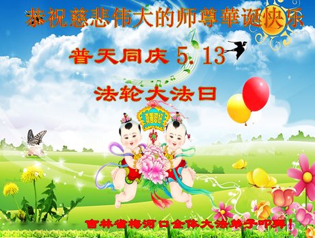 感恩师父慈悲救度、正念加持!弟子们叩拜师父! 吉林省通化市梅河口市全体大法弟子恭祝师尊华诞快乐!普天同庆法轮大法日!