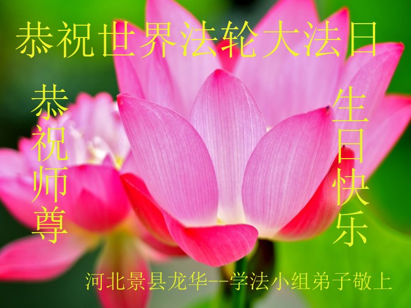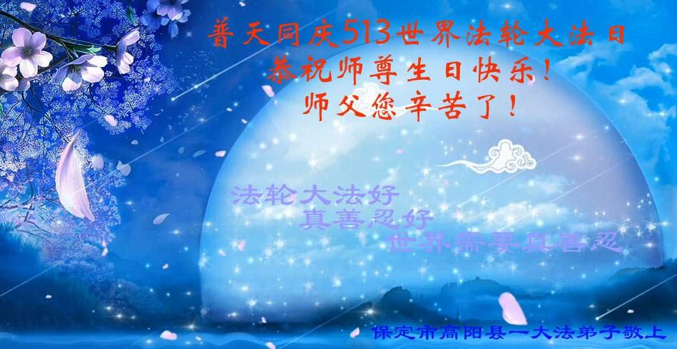 适逢五月十三日,世界法轮大法日暨师尊华诞,普天同庆!石家庄北二环学法小组大法弟子恭祝师尊华诞!恭贺世界法轮大法日!感谢师父的慈悲救度! 保定市高阳县一大法弟子恭祝师父生日快乐!