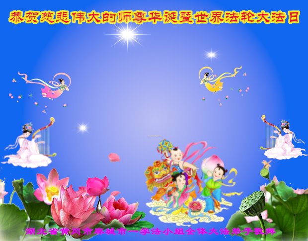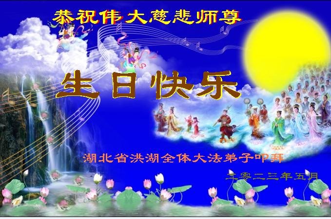 恭祝师父生日快乐!世界法轮大法日普天同庆! 法轮大法好!真善忍好! 湖北省荆州市洪湖市全体大法弟子恭祝伟大慈悲师尊生日快乐!