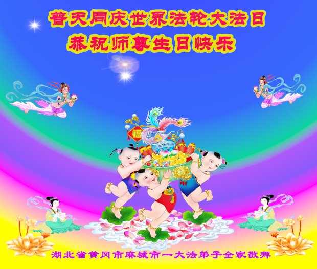 湖北省黄冈市麻城市一大法弟子全家恭祝慈悲伟大师尊生日快乐!普天同庆世界法轮大法日!