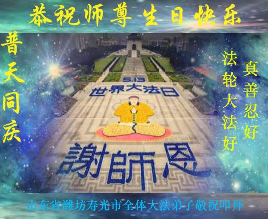 恭祝师父生日快乐!世界法轮大法日来临之际,日照全体大法弟子恭祝师父生日快乐!跪谢师父的救度之恩,做好三件事跟师父回家。 山东省日照市一学法小组敬上 2023年5月6日 山东大法弟子恭贺世界法轮大法日!恭祝慈悲伟大的师尊生日快乐!
