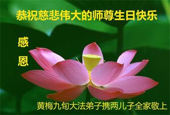 湖北黄梅九旬大法弟子携两儿子全家恭祝慈悲伟大的师尊生日快乐!