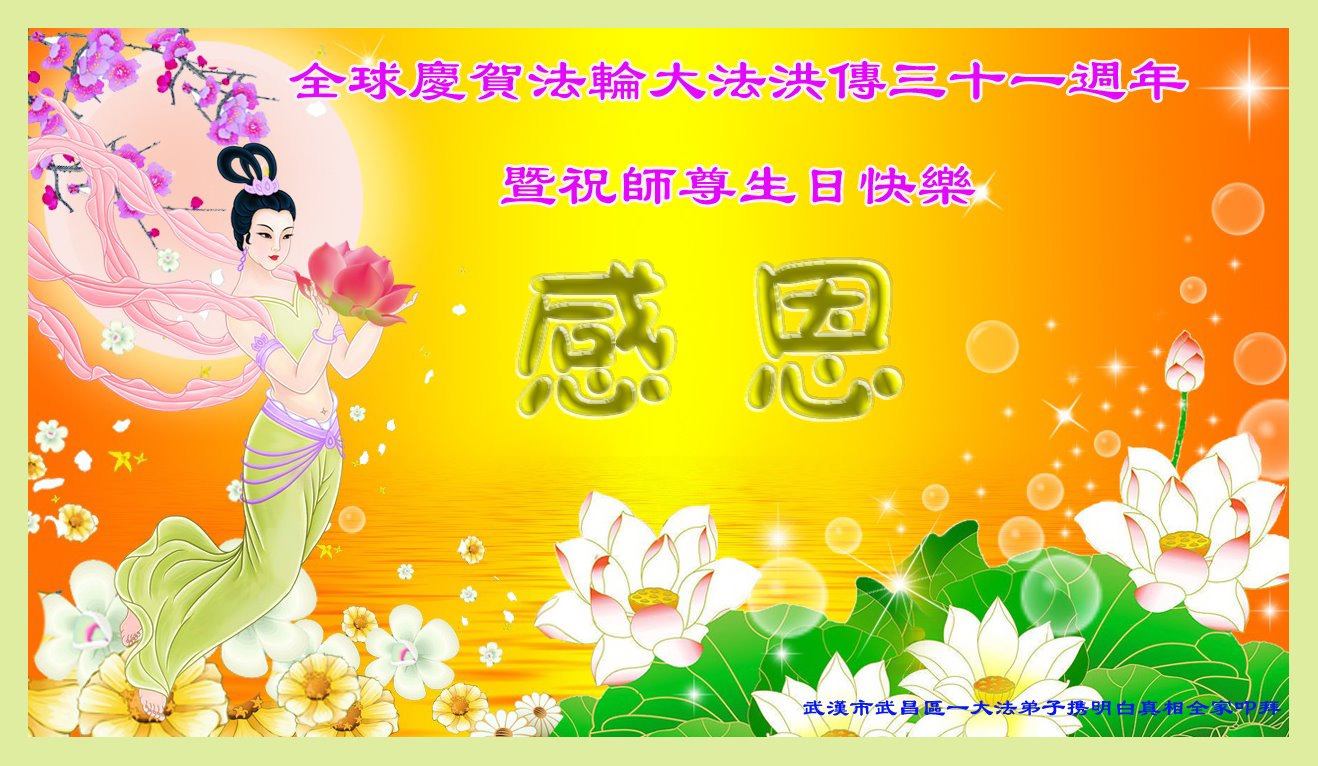 在这天上人间同祝、同庆、同颂的壮丽时刻,衷心恭祝创世主、我们慈悲伟大师尊生日快乐!没有人类的语言表达弟子对伟大师尊慈悲苦度的圣恩!值此借这光辉伟大节日之际,向伟大师尊问声好,以表达弟子的心声。 武汉市黄陂区全体大法弟子叩拜 二零二三年五月五日 湖北省武汉市陂区大法弟子恭祝世界法轮大法日暨伟大师尊华诞!