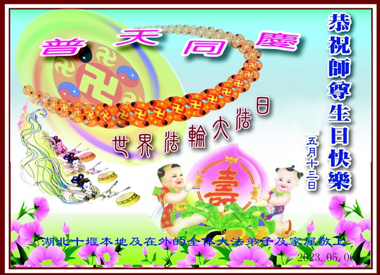 我们坚定紧跟师尊,助师正法,兑现誓约,共同精進,去迎接普天同庆的光辉时刻。 二零二三年五月八日 湖北省武汉市黄陂区全体大法弟子恭祝世界法轮大法日暨伟大师尊华诞!
