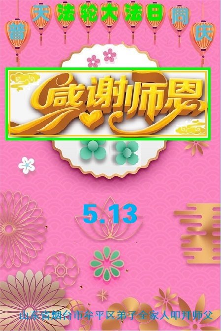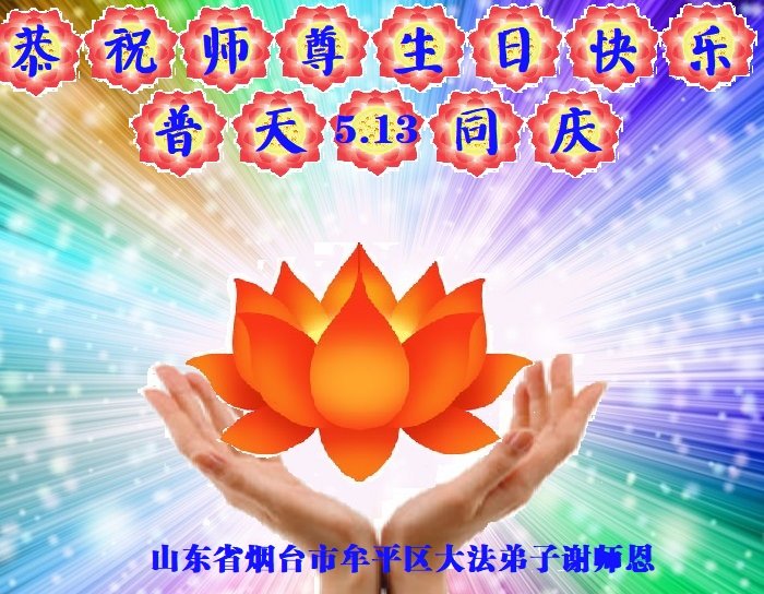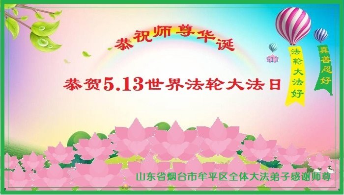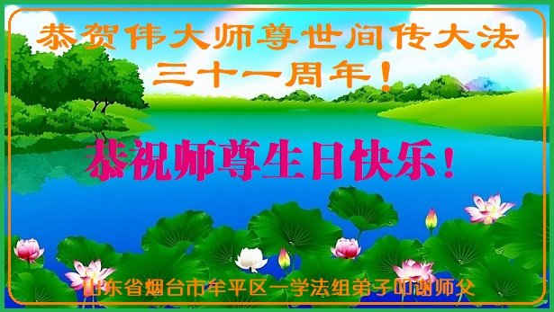 伟大的师尊您好!在“五·一三”美好的日子里,恭祝师尊生日快乐! 是您的法轮大法,教会了弟子事事向内找,善待他人,处处为别人着想;是师尊时刻看护着弟子与家人,给予我们安康、祥和、美满、富足…… 师尊的谆谆教诲,弟子铭记在心。虽然我们修炼中有很多不足,离师尊要求还相差很远,但我们时刻牢记自己是大法弟子,是有重大救人使命的大法徒! 请师尊放心,弟子一定放下人心,修好自己,兑现誓约,随师返家园! 叩拜师尊! 山东省烟台市牟平区全体大法弟子恭祝师尊传法三十一周年!