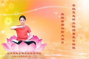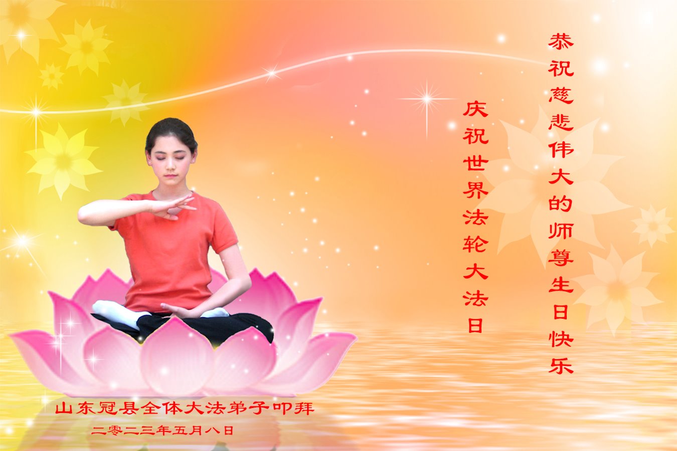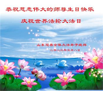 慈悲伟大的师尊好。师尊在您七十二岁华诞的日子即将到来之际,山东般阳大法弟子叩拜师尊,恭祝师父生日快乐! 师父,在您洪传大法三十一年的岁月里,弟子一路跟随师父经历了风风雨雨、惊涛骇浪的冲刷洗礼与磨练,弟子始终坚如磐石坚信大法、坚信师父丝毫不动摇,唯一的信念就是听师父的话,不折不扣的做自己应该做的三件事,完成自己的历史使命,跟师父回家。特别是拜读师父的新经文《为什么要救度众生》后,使弟子震惊、惭愧与感恩,百感交集涌上心头。师父啊,弟子不知怎么来感恩,一切词语都是苍白无力的,只有从惭愧中超出,在奋力中精進,在感恩中修好自己,在紧迫的时日里完成自己的使命,以报师恩之沧海一粟,再次叩拜师父! 山东般阳大法弟子 二零二三年五月六日 山东省沂水大法弟子祝贺世界法轮大法日暨恭祝师尊生日快乐!