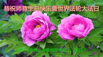 祝贺世界法轮大法日! 恭祝慈悲伟大的师尊生日快乐!祝贺法轮大法洪传三十一周年! 感恩师父的慈悲救度,做好三件事,多救人,让师父少些操劳,多一些欣慰。 叩拜师尊! 石家庄市俩大法弟子敬上 二零二三年五月六日 河北省石家庄市一学法小组老年大法弟子恭祝师尊生日快乐!
