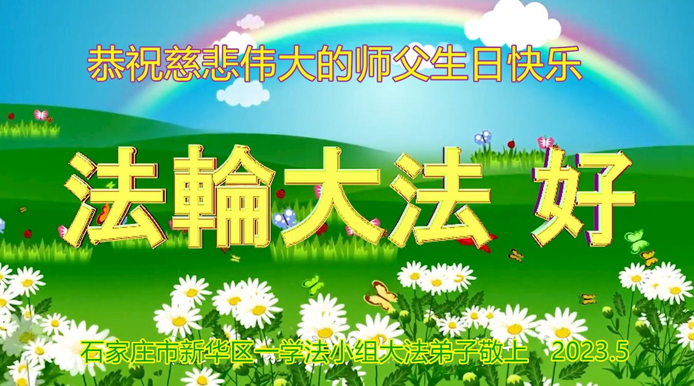 祝贺世界法轮大法日! 恭祝慈悲伟大的师尊生日快乐!祝贺世界法轮大法洪传三十一周年! 感恩师父的慈悲救度,紧跟师父正法進程,多救人,兑现誓约,圆满随师还。 石家庄市新华区一学法小组大法弟子敬上 二零二三年五月六日 河北省石家庄市一学法小组大法弟子恭祝师尊生日快乐!