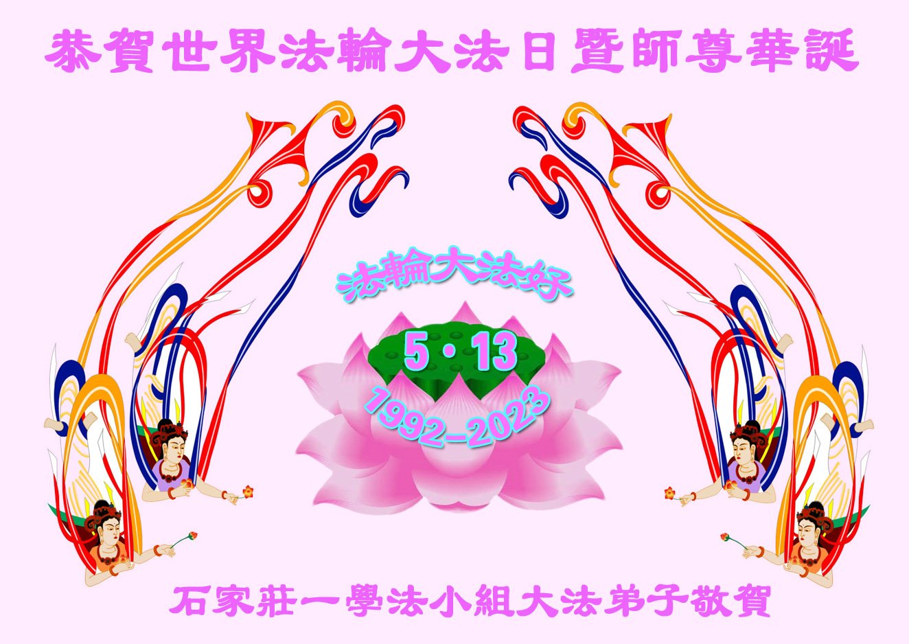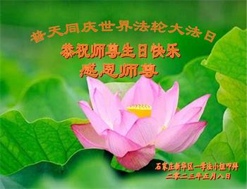 恭贺法轮大法洪传三十一周年!恭贺第二十四届世界法轮大法日!恭祝师尊七十二华诞快乐! 弟子得法修炼法轮大法二十七年了,从一个自我极其强烈的人,逐渐的放下自我,时时处处考虑别人,逐渐的达到无私为他的境界,都是师尊洪大的慈悲的恩赐。一点一滴的提高都离不开师尊的慈悲指引,我只有一颗向善的心,师尊就给予成全。用尽人类的语言也无法表达弟子对师尊的感恩。 得了法的生命是何等荣幸,今生能做师尊的弟子,助师正法,是我生命永恒的幸福。迷茫中是您给我驱散迷雾;魔难中是您全力保护;困境中是您牵着我的手走过来。 师尊啊,弟子想念您!盼望早日与师尊相聚。 石家庄大法弟子敬上 2023年5月8日 河北省石家庄开发区一学法小组全体大法弟子恭贺师尊华诞暨5.13世界法轮大法日!