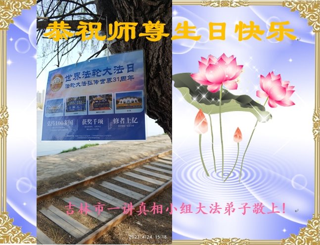 二零二三年五月十三日,是法轮大法洪传世界三十一周年暨慈悲的师父七十二岁华诞,同时是第二十四届世界法轮大法日。在这普天同庆的日子到来之际,我们老年学法小组全体大法弟子怀着无比崇敬和感恩的心,向慈悲伟大的师父问好,祝师父生日快乐! 我们学法小组十几年来,在慈悲伟大的师父看护下,尽管在邪*党-的残酷迫害形势下,我们正念正行安全的走到今天。我们按照师父的教诲,认真踏实的做好三件事,学好法,修好自己,发好正念,解体和清除来自各方面的干扰和迫害。坚持面对面讲真相,多救度世人。让师父多一份欣慰。 学了师父《为什么会有人类》和《为什么要救度众生》两篇经文后,更感我们的使命重大、时间更紧迫。请师父放心:我们学法小组全体更加努力做好三件事、助师正法多救人,圆满跟师父回家。贵州老年大法弟子学法小组敬上。 吉林省通化市一讲真相小组大法弟子恭贺师尊华诞!恭贺世界法轮大法日!