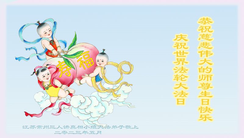 普天同庆五一三 师尊圣恩满人间 为救众生造三界 盼望法徒都回天 遥拜恩师泪涟涟 圣缘一牵两亿年 讲清真相多救人 牵手众生随师还 江苏常州三人讲真相小组大法弟子恭祝慈悲伟大的师尊生日快乐!庆祝世界法轮大法日!