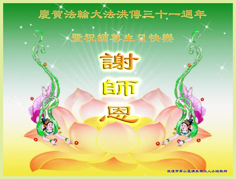 简阳大法弟子恭贺世界法轮大法日二十四周年!大法弟子很想念慈悲伟大的师尊,盼望师尊早日回国与弟子们团圆! 有的老弟子都快九十岁了!本地真修弟子都知道救人的紧迫,都听师父的话:努力做好子弟子该做好的三件事,多救人。特别是第一线发资料的同修们:他们针对不同人的接受能力,面对面讲、面对面发资料、劝三:退.,大家都以苦为乐,助师救人,坚修大法到底,圆满跟师父回家。 四川简阳三岔大法弟子敬上 湖北武汉市一广传真相小组五位大法弟子恭祝慈悲伟大的师父生日快乐!恭祝世界法轮大法日!