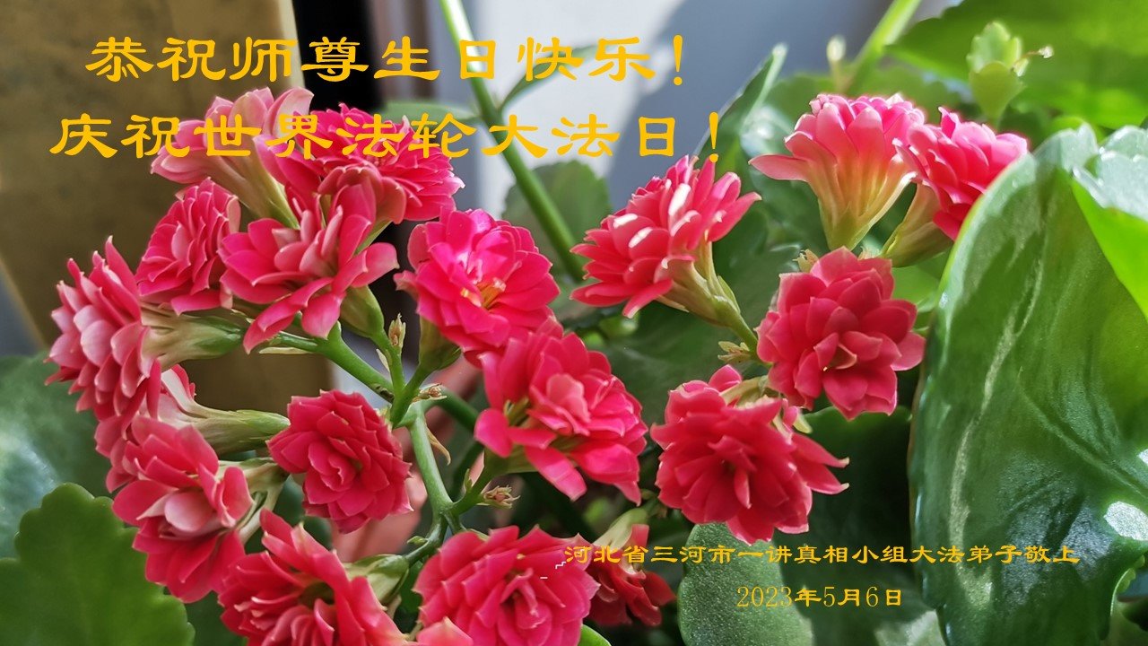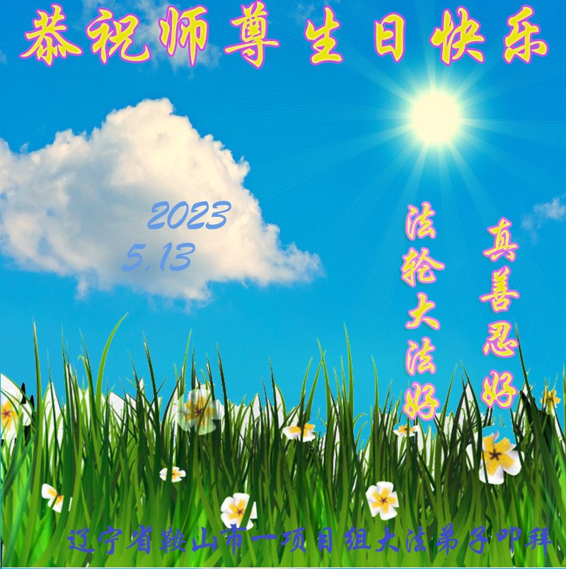 5·13是普天同庆的日子,我们讲真相小组大法弟子向师尊献上最诚挚的祝福:恭祝师父生日快乐!恭祝世界法轮大法日!弟子们很想念您。 弟子们无限感恩您对弟子修炼厉程中的慈悲点悟与时时保护,我们都在努力的救人,我们互相配合,互相圆容。在修炼中对照大法,以法为师,以真、善、忍的标准归正自己的言行。 弟子们会努力做好三件事,正念正行,精進实修,走好助师正法的路,跟上师父的正法進程。叩谢师尊的慈悲苦度! 弟子们跪拜、叩谢、恭祝师尊生日快乐! 吉林省通化市一讲真相小组大法弟子敬上 二零二三年五月五日 辽宁锦州黑山一个真相小组大法弟子恭祝师父华诞暨世界法轮大法日!