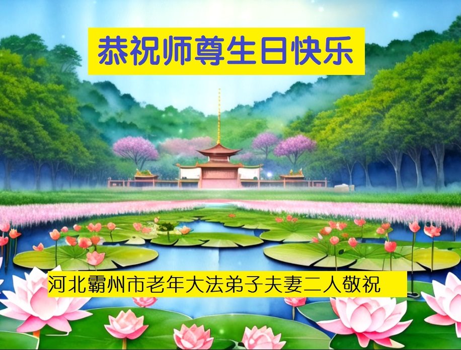 河北廊坊霸州市老年大法弟子夫妻二人恭祝慈悲伟大的师父生日快乐!