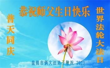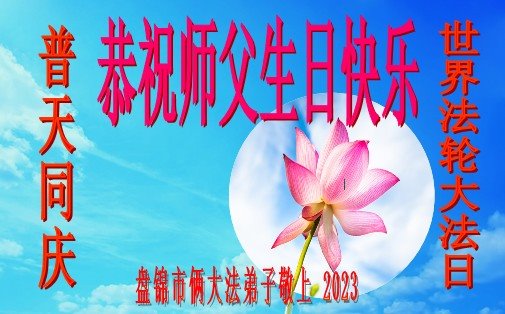【明慧网二零二三年五月十三日】 辽宁省盘锦市七大法弟子恭贺世界法轮大法日!恭祝师父生日快乐!