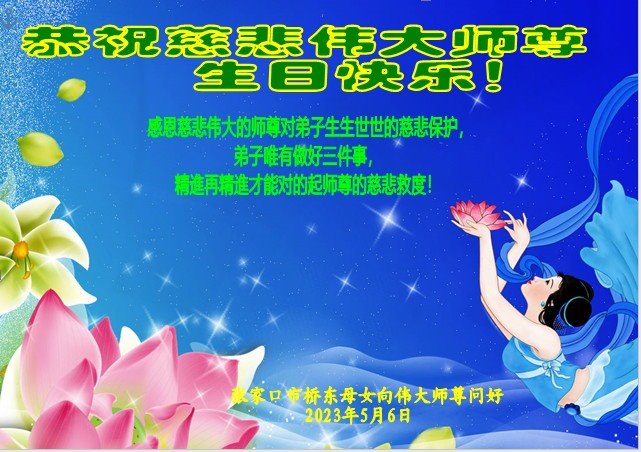感恩慈悲伟大的师尊对弟子生生世世的慈悲保护,弟子唯有做好三件事,精進再精進才能对的起师尊的慈悲救度! 张家口市桥东母女大法弟子向伟大师尊问好 2023年5月6日 河北张家口市宣化区一学法小组全体大法弟子恭贺法轮大法日!恭祝师父生日快乐!