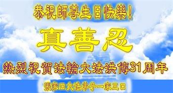 在这法轮大法洪传世界三十一周年之际,我们全体大法弟子庆贺第二十四届世界法轮大法日!并恭祝慈悲伟大的师尊72华诞生日快乐!在此叩谢师尊慈悲苦度,师尊辛苦了!我们要進精進实修,圆满随师还。惟愿师尊笑。 合十 弟子们跪拜师尊! 河北省张家口市怀来县大法弟子恭祝师尊生日快乐!