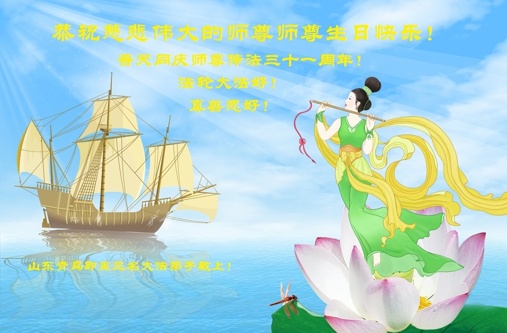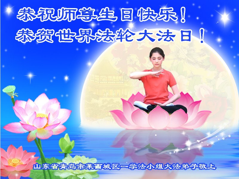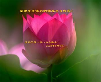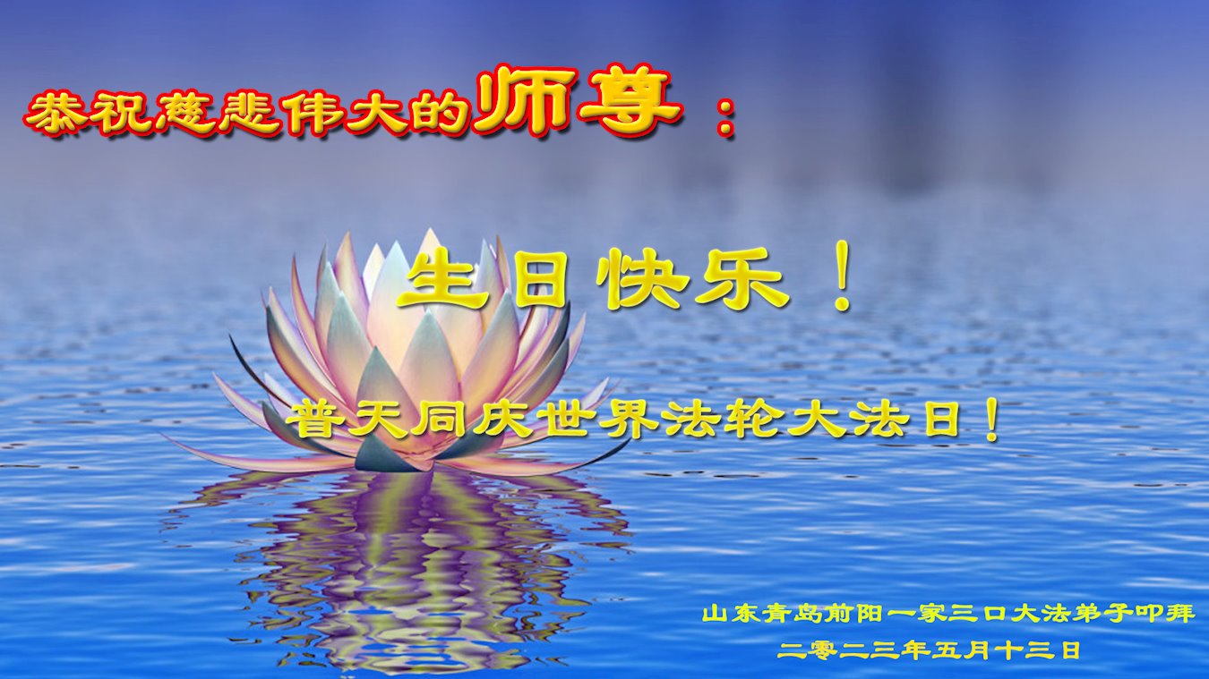 山东省青岛一大法弟子及家人恭祝慈悲伟大的师父生日快乐!