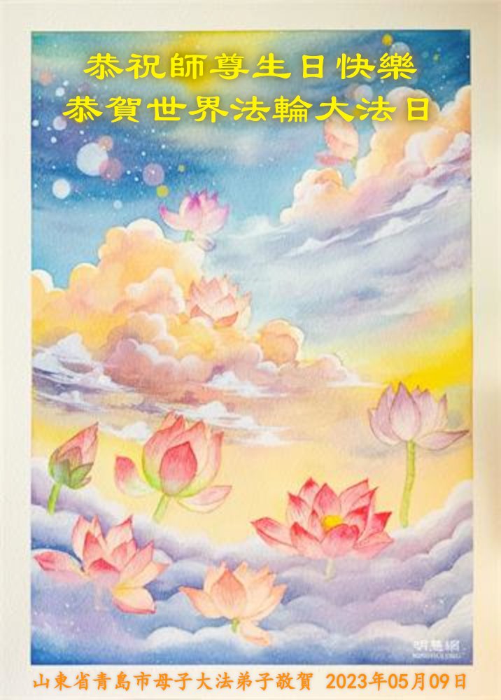 弟子感恩师尊慈悲救度!弟子一定精進实修多救人,兑现誓约跟师父回家。 2023年5月9日 山东省青岛大法弟子恭祝师尊生日快乐!恭贺世界法轮大法日!