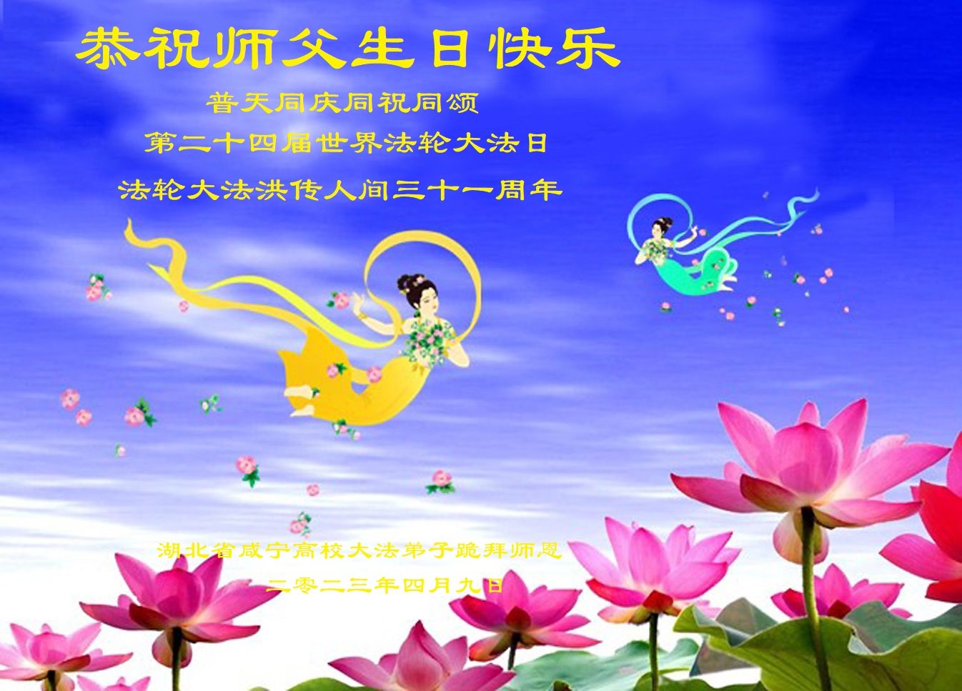 湖北省咸宁市高校大法弟子恭祝师父生日快乐!普天同庆同祝同颂法轮大法洪传人间三十一周年!