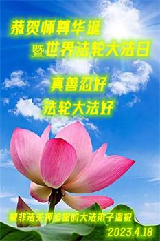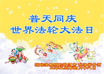 在这普天同庆、寰宇同贺的日子里,我们学法小组全体大法弟子聚集一堂,恭祝慈悲伟大的师尊生日快乐!庆祝“世界法轮大法日”! 感恩师尊在新年伊始发表新经文《为什么会有人类》及最近发表的经文《为什么要救度众生》,已经向世人讲明了真相。我们大法弟子更应该在最后的时间助师正法,做好师尊要求的三件事,多讲真相,多救世人,不负自己的史前誓约,圆满随师还! 又是一年“五·一三” 这个日子不平凡。 师尊慈悲传大法, 唤醒亿徒践誓言。 为救洪穹伤圣体, 巨业巨难一身担。 师尊保护众弟子, 一步一步扶向前。 每到五月十三日, 亿万法徒把恩感: 感恩师尊传大法, 感恩师尊迷众唤; 感恩师尊拯坏宇, 感恩师尊开新寰。 每当想起师洪恩, 深知责任沉甸甸。 唯有谨遵师教诲, 每天做好事三件。 最后时刻要抓紧, 弟子责任记心间。 好好兑现史前约, 多救众生随师还。 湖北省武汉新园学法小组大法弟子贺世界法轮大法日!祝师尊生日快乐!