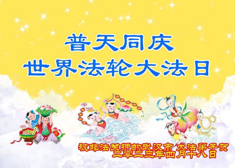 普天同庆同祝同颂第二十四届世界法轮大法日! 普天同庆同祝同颂法轮大法洪传人间三十一周年! 谢师恩 大穹危难师父拦 传法正法一肩担 慈悲救度天地人 一再延长法时间 成就弟子佛道神 普天苍宇谢师恩 咸宁市高校大法弟子敬上 被非法关押的湖北省武汉大法弟子恭贺世界法轮大法日!