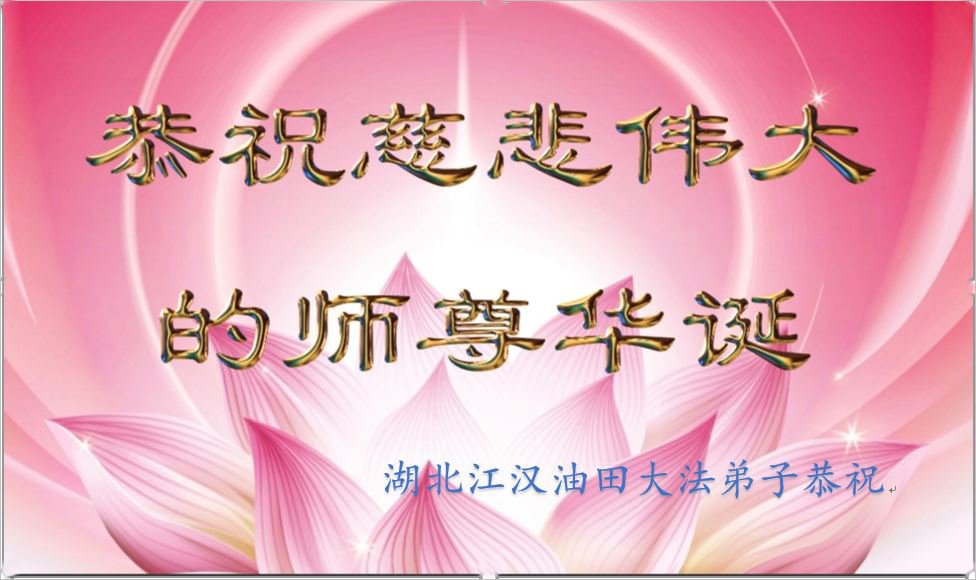 感恩师尊把我们从地狱中捞起!感恩师尊给我们第二次生命!感恩师尊对我们的慈悲苦度!我们只有精進实修,不断的向内找,修去人心,坚定的做好作为弟子应该做好的三件事。坚修大法到底,随师把家还。合十 湖北省武汉市江岸区一大法弟子恭贺师尊华诞!普天同庆法轮大法洪传31周年!