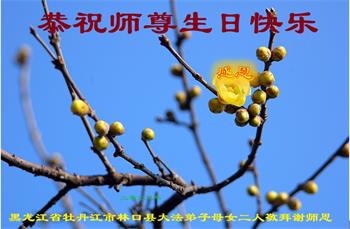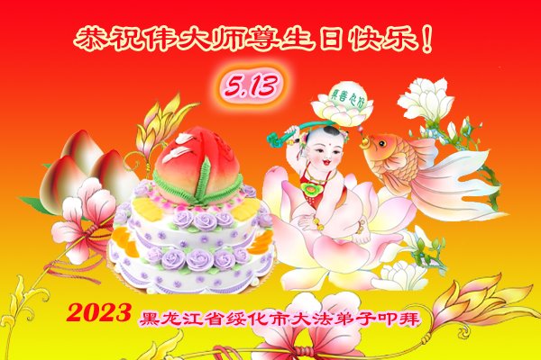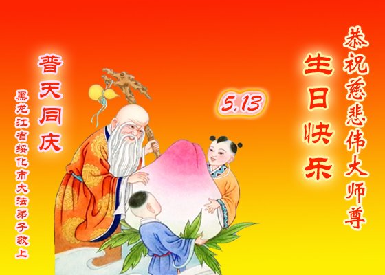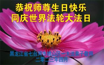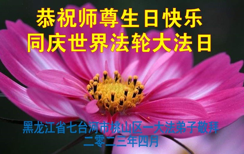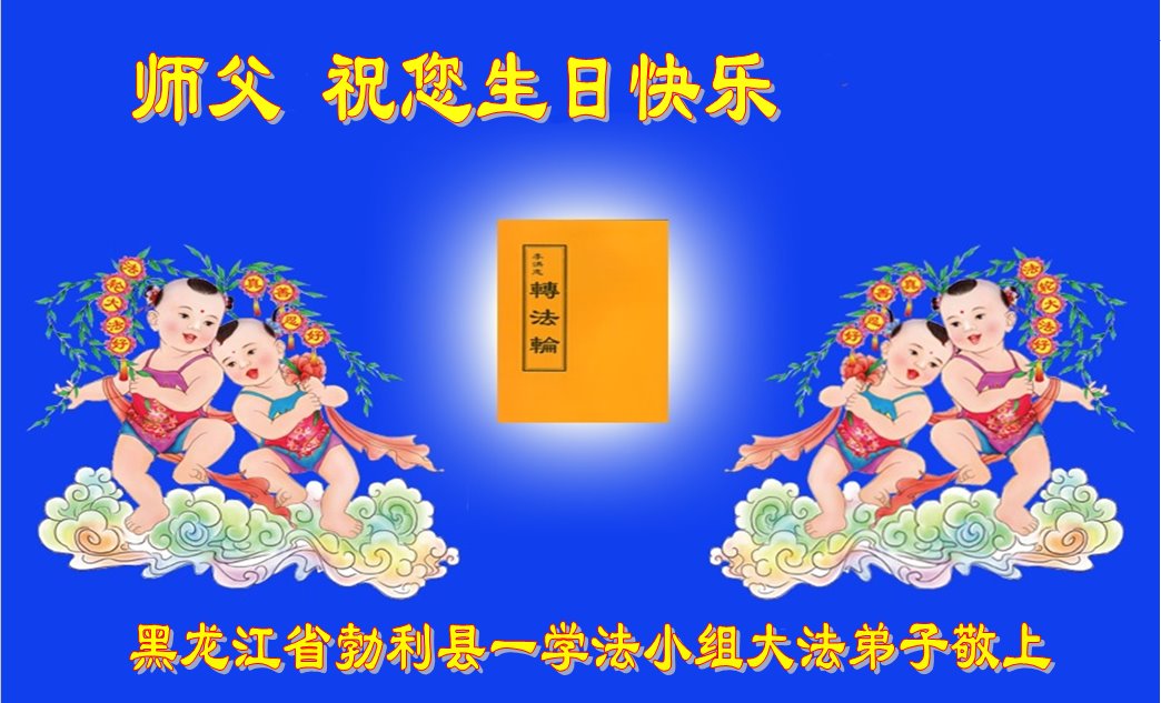 在世界法轮大法日---五·一三来临前夕,在远离师尊的中国大陆(黑龙江)大法弟子,跪拜恭祝慈悲伟大的师尊生日快乐!师尊的新经文《为什么会有人类》发表以后,经过反复学习、深入领会,认识到这万古不遇的正法修炼已進入尾声,留给我们做好三件事,讲真相救人的时间也已倒数计时。弟子一定谨遵师尊教导:多学法,坚持修心向内找,坚持晨炼、多发正念,尽力讲清真相多救人。不辱使命,兑现史前誓约,走正走好最后的路,跟随师父回归真正家园。 五常市六位老年大法弟子敬上 黑龙江省七台河市桃山区一大法弟子恭祝师尊生日快乐!