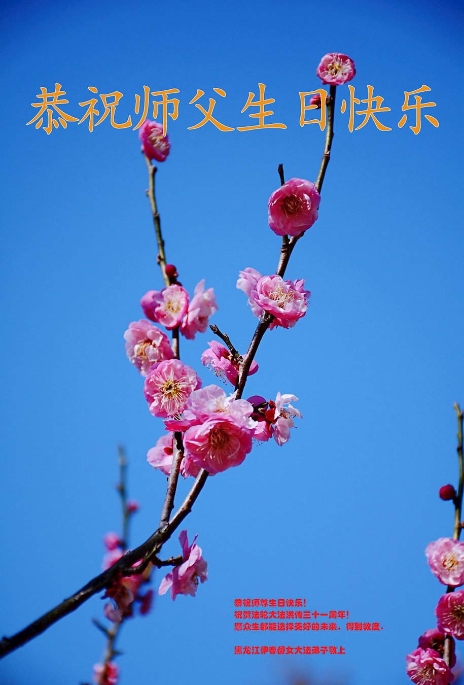 恭贺世界法轮大法日! 无比敬仰的师尊: “五·一三”世界法轮大法日暨师尊的华诞就要到了,我们在中国大陆北方跪拜师尊,叩谢师恩,普天同庆法轮大法洪传三十一周年。 大法弟子及众生沐浴在法光中,不断成熟着,不断清醒的认识了自己的生命价值。特别是师父发表了《为什么会有人类》、《为什么要救度众生》两篇经文,使众生觉悟,使大法弟子更明确了自己救度众生的使命。我们一定要好好学法,无条件的向内找,修好自己,完成救度众生的使命,跟师父圆满回天廷。 恭祝师尊生日快乐! 黑龙江母女大法弟子恭祝师尊生日快乐!恭贺世界法轮大法日!