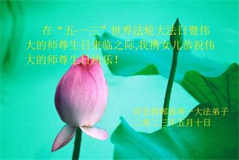 河北省邯郸曲周县一位大法弟子携女儿敬贺法轮大法日!