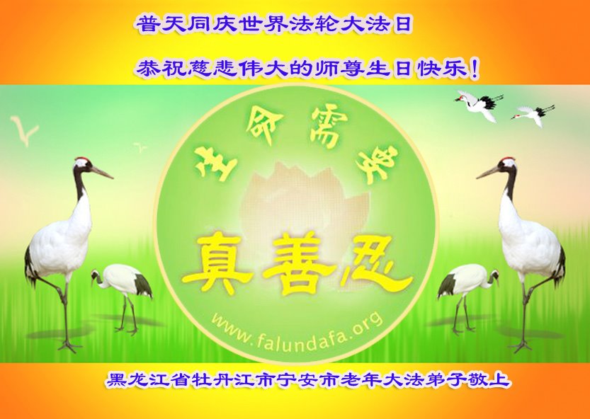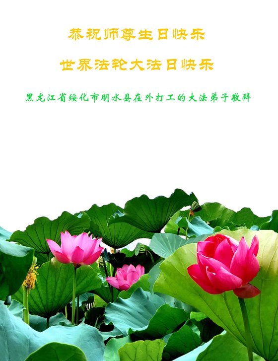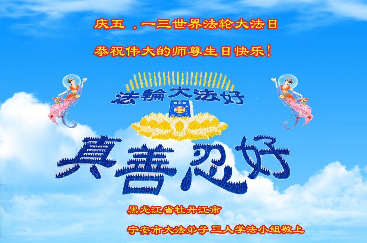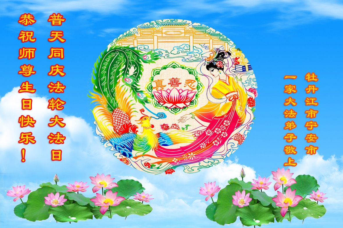 黑龙江省三人学法小组大法弟子恭祝法轮大法弘传31周年!在这法正人间的时刻,我们一定会尽自己的努力学好法,向内找,修去执着心,多救人,随师父圆满回家,再次祝师父生日快乐! 黑龙江省牡丹江市宁安市大法弟子一家人恭贺法轮大法日恭祝师父生日快乐!