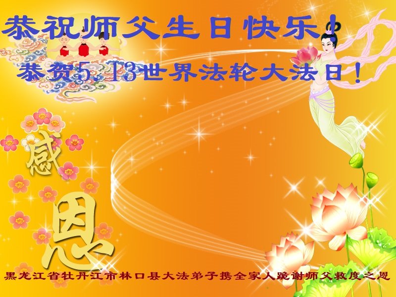 黑龙江省牡丹江市林口县大法弟子携全家人恭祝师尊生日快乐!恭贺5.13世界法轮大法日!