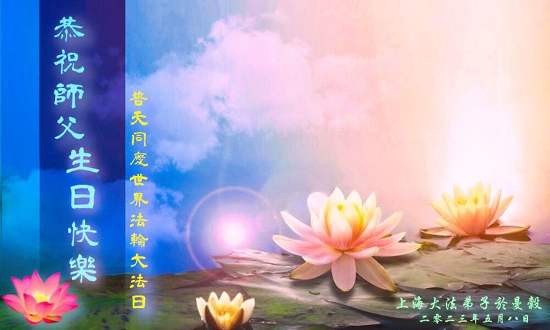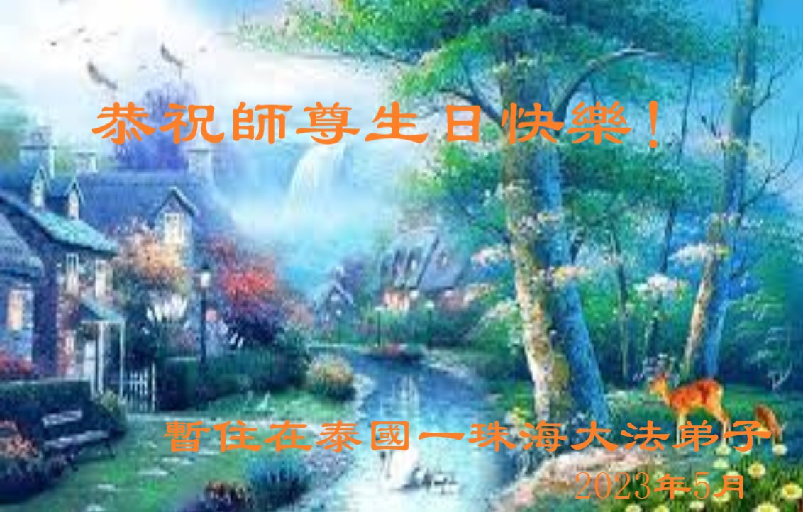 师尊您好!您辛苦了! 感恩师尊救度之恩,谢谢师尊为弟子所承受与付出的一切,弟子无以回报,弟子一定珍惜这千金一瞬的时刻,三件事中修心性更精進,兑现誓约和师尊回家。 暂居泰国的吉林一家大法弟子敬上 二零二三年五月 暂住在泰国的珠海一大法弟子恭祝师尊生日快乐!