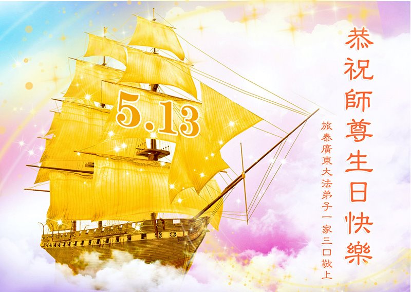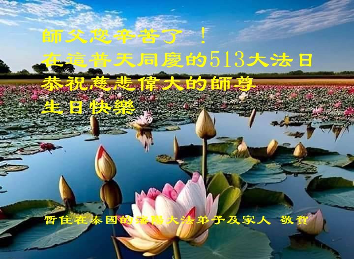 师父您辛苦了! 在这普天同庆的513大法日恭祝慈悲伟大的师尊生日快乐! 旅居泰国的广东大法弟子一家三口恭祝师尊生日快乐!