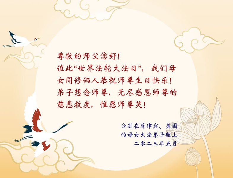 分别在菲律宾、美国的母女大法弟子恭祝师父生日快乐!